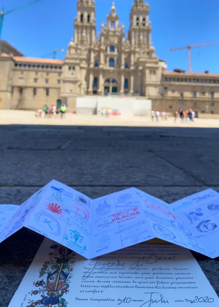 圣地亚哥-德孔波斯特拉(Santiago de Compostela)似乎真的有圣雅各的庇佑,一路的幸福和幸运在到达终点后达到了峰值。在朝圣者办公室,工作人员在朝圣者护照上盖上了最后一个印章,并且给我们颁发了象征着完成了朝圣的朝圣者证书。坐在大教堂广场上看着来来往往的鸽子和朝圣者,我到现在为止已经可以说是一个完整的“人”了。没想到回到爱泊阁后竟然碰上了两个中国人和一个会讲中文的西班牙教授!要知道我们这一路只碰到了一位台湾同胞且没有任何交流,在终点竟然一下遇见了三个讲中文的朋友!他们是以圣地亚哥-德孔波斯特拉为起点前往“世界尽头”菲斯特拉(Fisterra)和穆希亚(Muxía)的,今天是出发的第一天,而我们是完成的最后一天。就像其中的一位老师所说,是我们把接力棒从León带到了这里,接下来要交到他们的手里,由他们带到世界尽头。